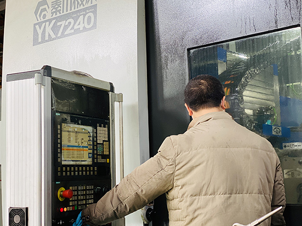 本公司机床即用蜗杆砂轮与齿轮(工件)连续展成啮合原理来磨削、数控系统保证蜗杆砂轮与齿轮(工件)间的严格同步比例传动,直接驱动技术消除了机械传动链带来的误差,提高了加工精度和齿轮齿面质量。又可采用高速多头蜗杆砂轮、位移磨削、自动对刀等先进技术以适应高效、精密磨削。机床磨削过程采用自动磨削工作循环,蜗杆砂轮的修整过程采用自动修整工作循环。